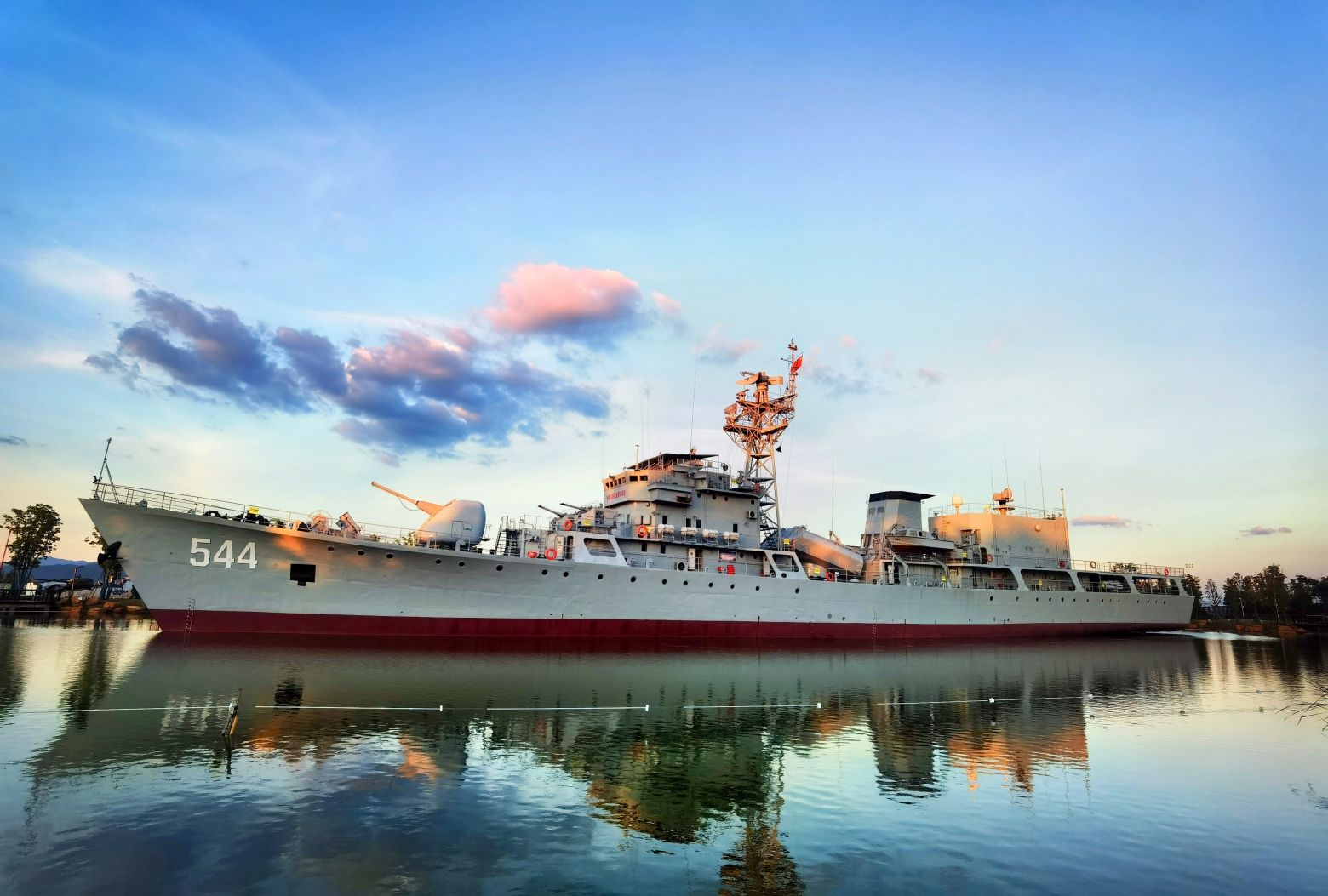 旅顺号导弹护卫舰由中国人民解放军总装备部捐赠。舰长103.2米,宽10.8米,吃水深度3.19米,标准排水量为1600吨,满载排水量为1900吨,该舰是我国带有实验性质的技术先行舰,是我国海军第一艘搭载直升机的护卫舰。中国海军将其命名为“四平”,舷号544,,后更名为旅顺(这是我国海军第一艘以县级城市命名的舰艇)。旅顺号导弹护卫舰虽然没有参加过正式的战役,但它在执行跟踪驱逐不明国籍的潜艇任务中,创造了连续跟踪65小时并将其驱逐出境的战例,被誉为“中华反潜第一舰”。