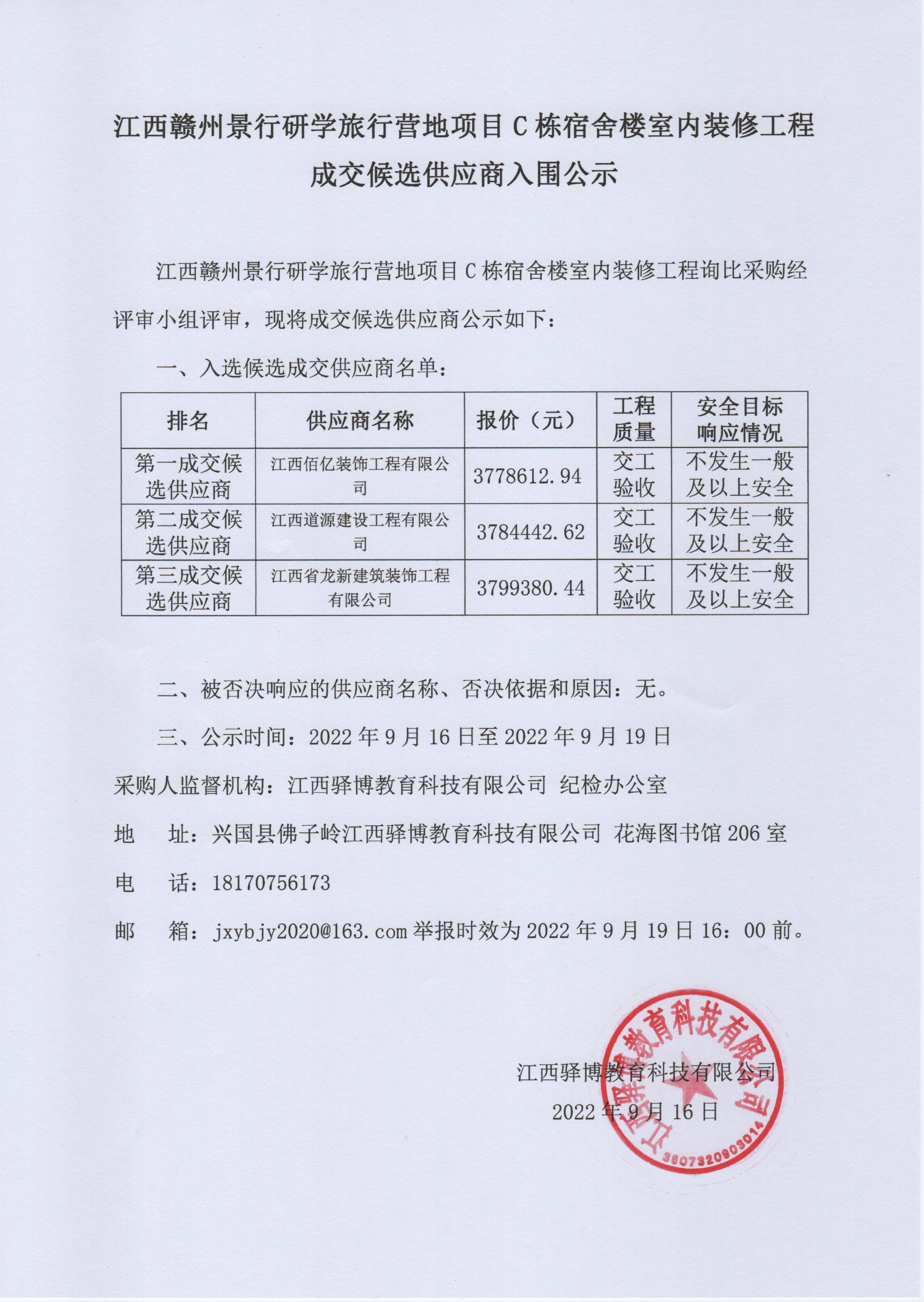 江西赣州景行研学旅行营地项目C栋宿舍楼室内装修工程成交候选供应商入围公示